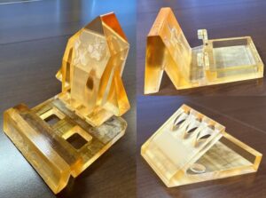 人気のオリジナルスマホスタンド製作の実習では、今年も面白いデザインのスタンドが完成しました。